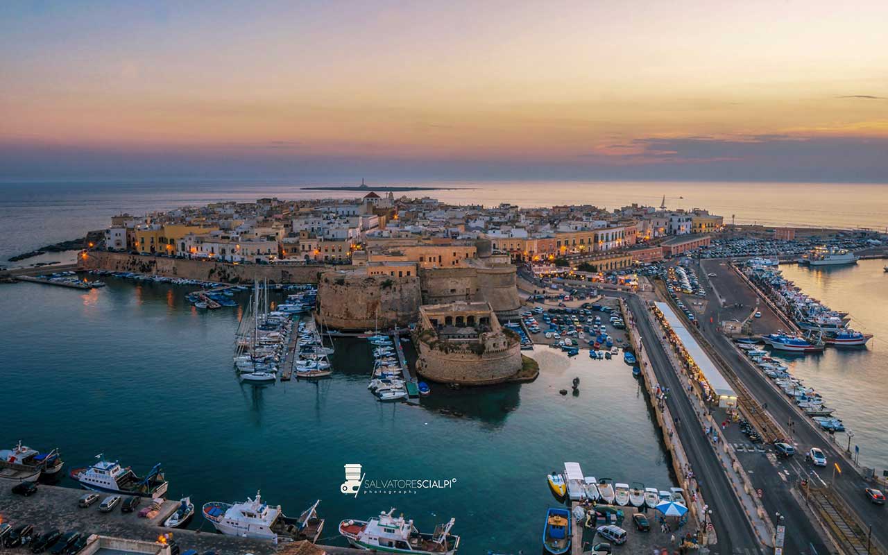 Conosciuta come la "Perla del Salento", è famosa per le sue splendide spiagge che attirano turisti da tutto il mondo. La città vecchia, situata su un'isola collegata alla terraferma da un ponte, ospita numerosi monumenti e attrazioni storiche, tra cui la cattedrale di Sant'Agata e il Castello Angioino.